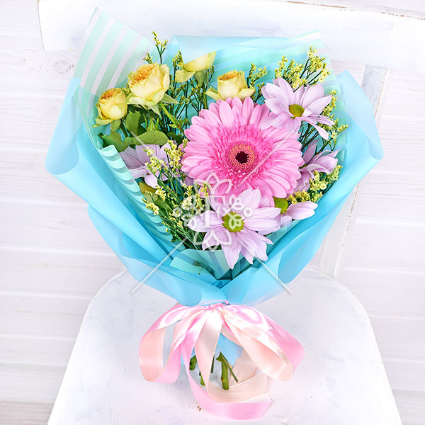 Гербера розовая- 1 шт., хризантема кустовая сиреневая -1 шт., роза желтая кустовая - 1 шт., лимониум желтый – 1 шт., упаковка, лента.